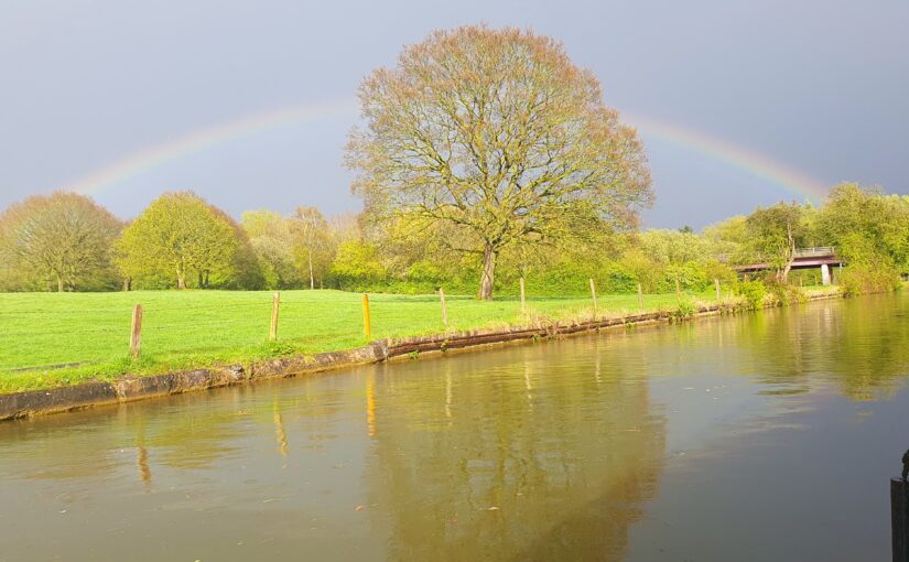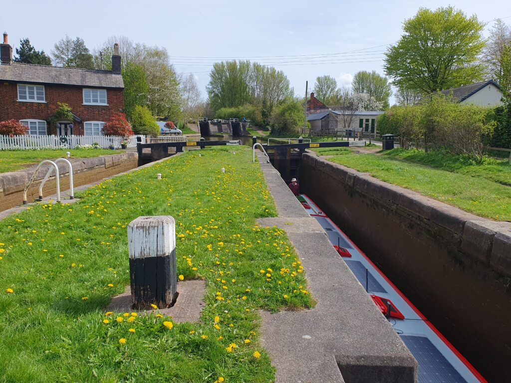 After our traumatic wake up sliding ungracefully out of bed on Monday morning, we were relishing a few days of a rural idyll. It’s funny how coming through the Harecastle Tunnel is a bit like teleporting us into a completely different world. The rundown redbrick industrial revolution makes way for green growth and rural beauty. It’s the contrasts that keep this living adventure alive and so exciting for us. Even the same stretch of canal can look very different as the seasons change. Today we woke up in Cheshire not Staffordshire- where Firecrest had been since the 3rd May 2025. The actual county border is where the Macclesfield canal aqueduct crosses over the Trent and Mersey Canal at Hardings Wood Junction although we weren’t in the right frame of mind to celebrate at the time. Today we were setting off down the hill, aiming to get back to the Paintshed where Nick was going to reseal our leaking portholes. But we weren’t rushing. It might only be 13 miles to Middlewich but there are a lot of locks to work through. At least they are pretty.